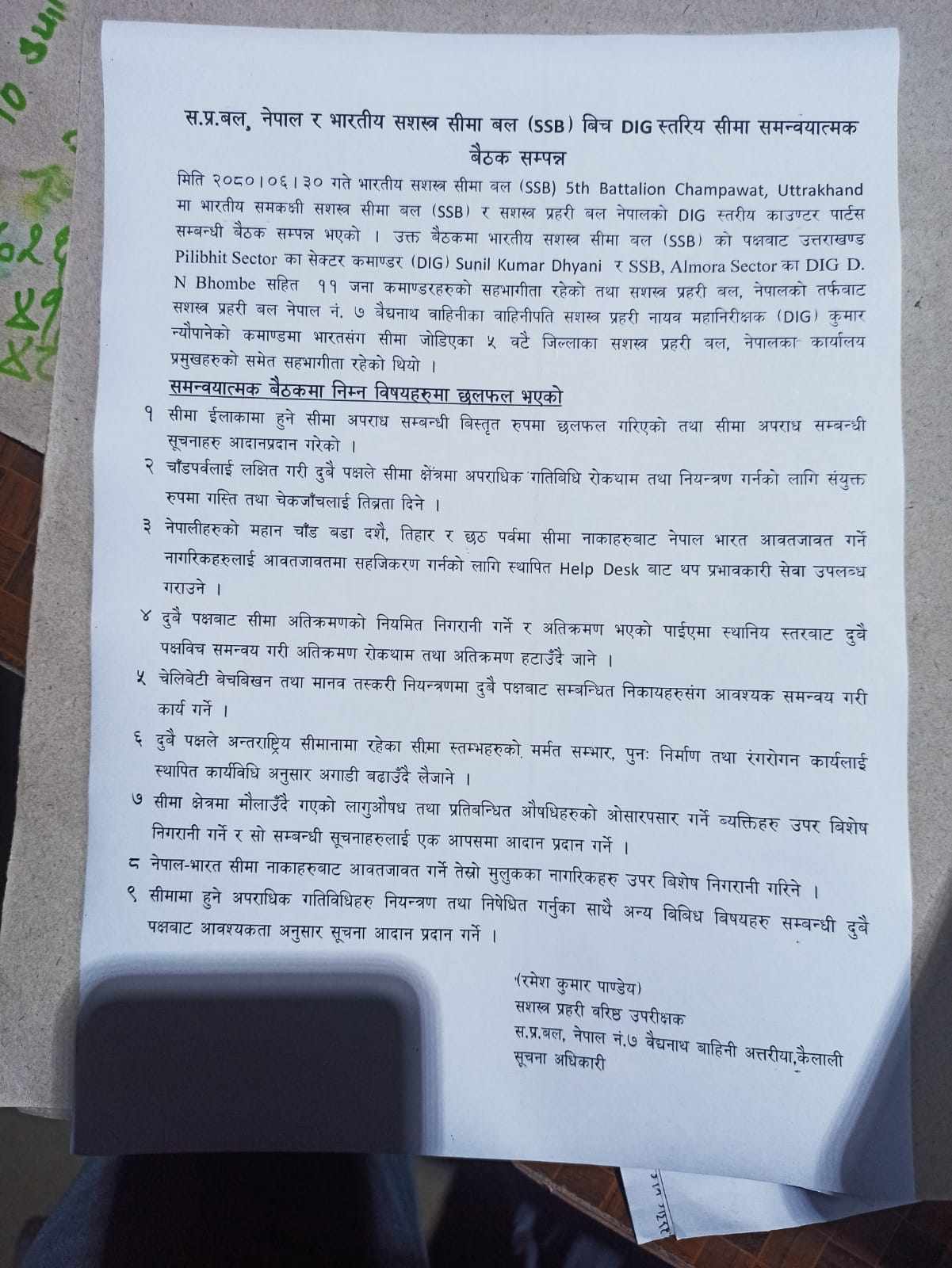 उक्त समन्वयात्मक बैठकमा सीमा ईलाकामा हुने सीमा अपराध सम्बन्धी विस्तृत रुपमा छलफल गरिएको थियो । यस्तै सीमा अपराध, सूचनाहरु आदानप्रदान, चाडपर्वलाई लक्षित गरी दुवै पक्षले सीमा क्षेत्रमा अपराधिक गतिविधि रोकथाम तथा नियन्त्रण गर्नको लागि संयुक्त रुपमा गस्ति तथा चेकजाँचलाई तिब्रता दिने, नेपालीहरूको पर्व दशै, तिहार र छठ पर्वमा सीमा नाकाहरुबाट नेपाल भारत आवतजावत गर्ने नागरिकहरुलाई आवतजावतमा सहजिकरण गर्नको लागि स्थापित हेल्प डेस्कबाट थप प्रभावकारी सेवा उपलब्ध गराउने, दुबै पक्षबाट सीमा अतिक्रमणको नियमित निगरानी गर्ने र अतिक्रमण भएको पाईएमा स्थानीयस्तरबाट दुवै पक्षबीच समन्वय गरी अतिक्रमण रोकथाम तथा अतिक्रमण हटाउँदै जाने विषयमा छलफल भएको थियो ।